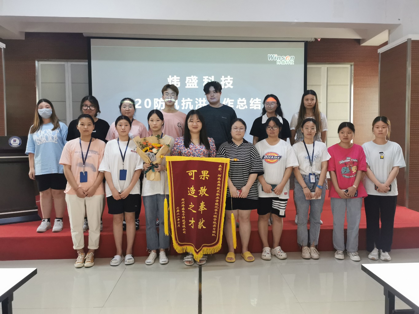 为了表彰在7·20特大洪水灾害中涌现出来的一批不怕困难、果断勇敢的优秀员工,弘扬“尽责、创新、厉行价值创造、铸就同一个汉威”的核心价值观,发扬抗洪救险、众志成城的精神,炜盛科技于2021年7月27日在会议室举办了这场7·20防汛抗洪工作总结大会。化学工程学院共17名实习生及教师代表参加了本次大会。