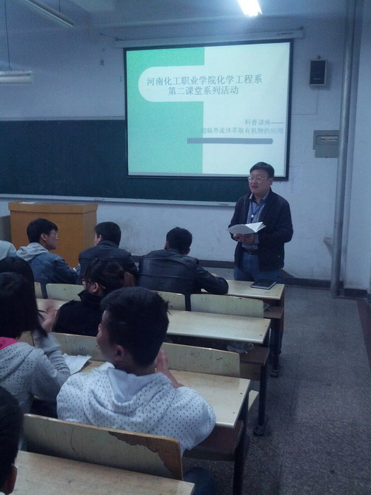 活动中,韩老师深入浅出讲述了超临界流体萃取技术,同学们兴趣勃勃,讲座氛围活跃。朱书记和部分同学对讲座内容进行了提问交流,韩老师作出了解释和引导。会后,朱书记对此次讲座进行了总结,他说,此次讲座让他感到学术上的差距,感到化工的博大精深,坚定了做化工人的信念。他希望参加的同学也能从中有所体会,逐渐扩大知识面,为今后的发展打下基础。