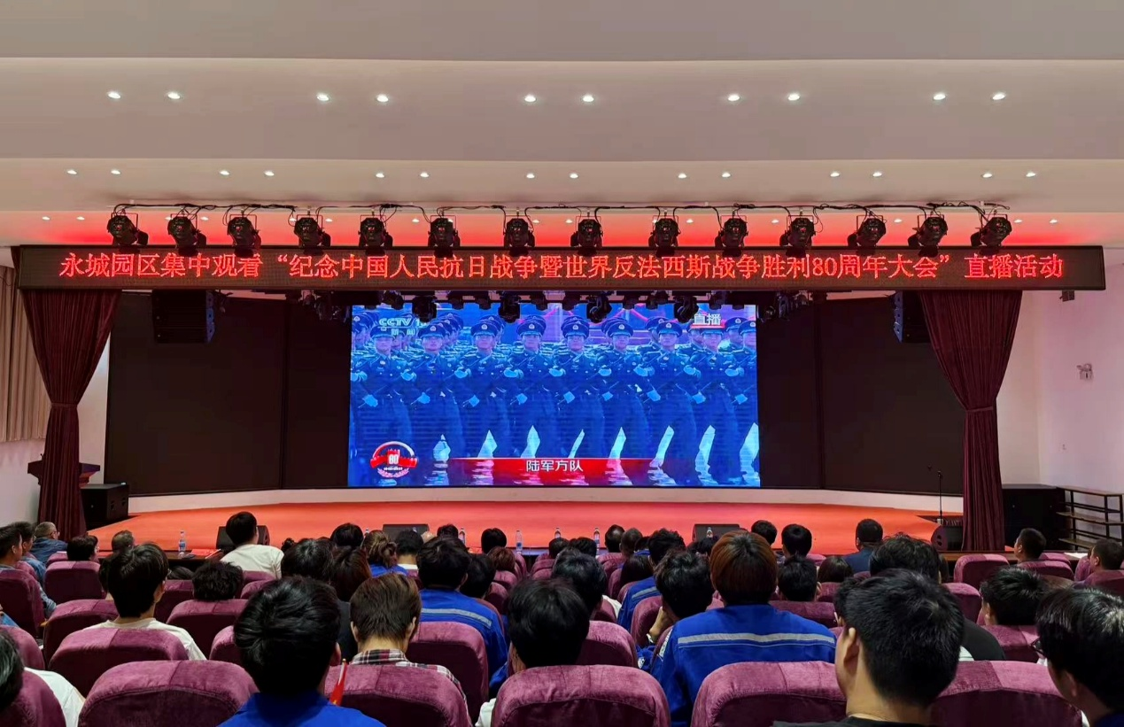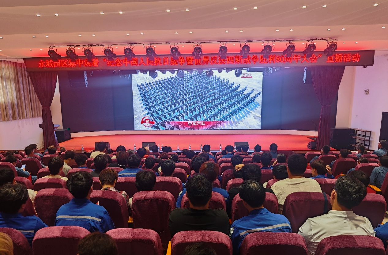 9月3日上午,化学工程学院能源化工产业学院2401班的57名学生,在永城龙宇煤化工有限公司的礼堂,与单位职工代表一同观看了纪念中国人民抗日战争暨世界反法西斯战争胜利80周年大会直播。