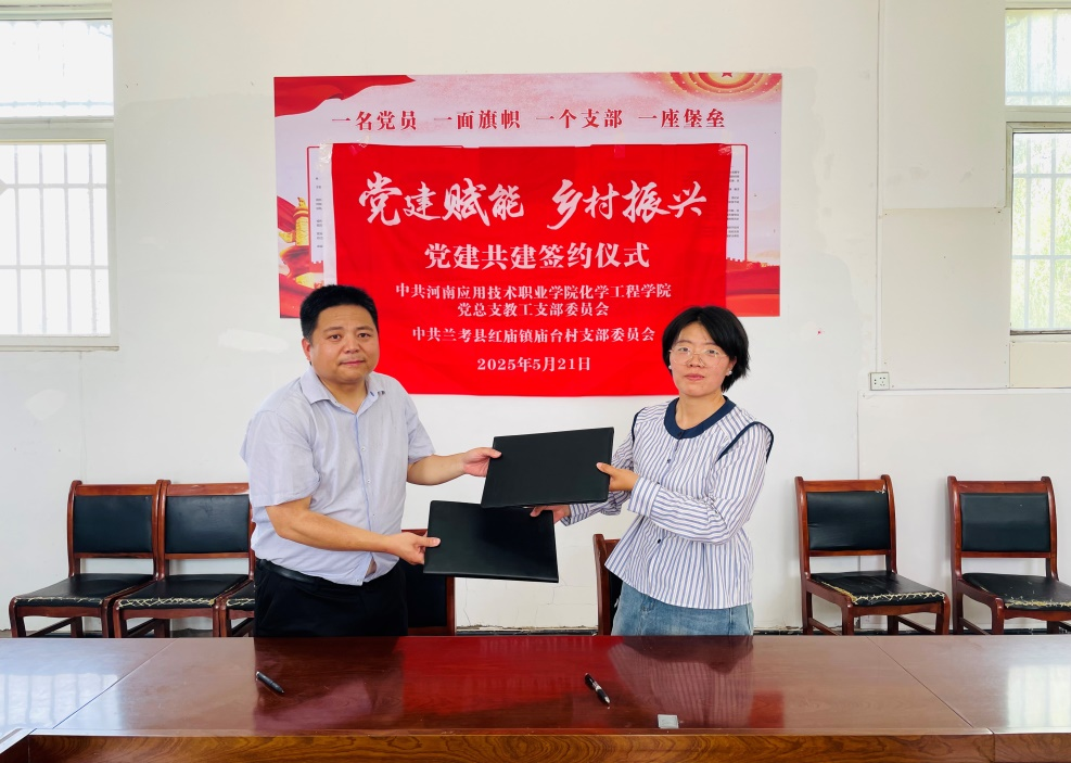 活动结束后,中共beat365中文官方网站党总支教工支部委员会与中共兰考县红庙镇庙台村党支部委员会签订《乡村振兴技术帮扶协议》,推动专业与产业对接、教学过程与生产过程对接,在党建赋能乡村振兴的同时,进一步提升应用化工技术高水平专业群建设。化学工程学院党总支书记陈永惠、党总支副书记常惟诚、副院长岳瑞丰,协管员范雨欣及驻村第一书记任旭凯、队员李盈、陈开友等共同参与签约活动。