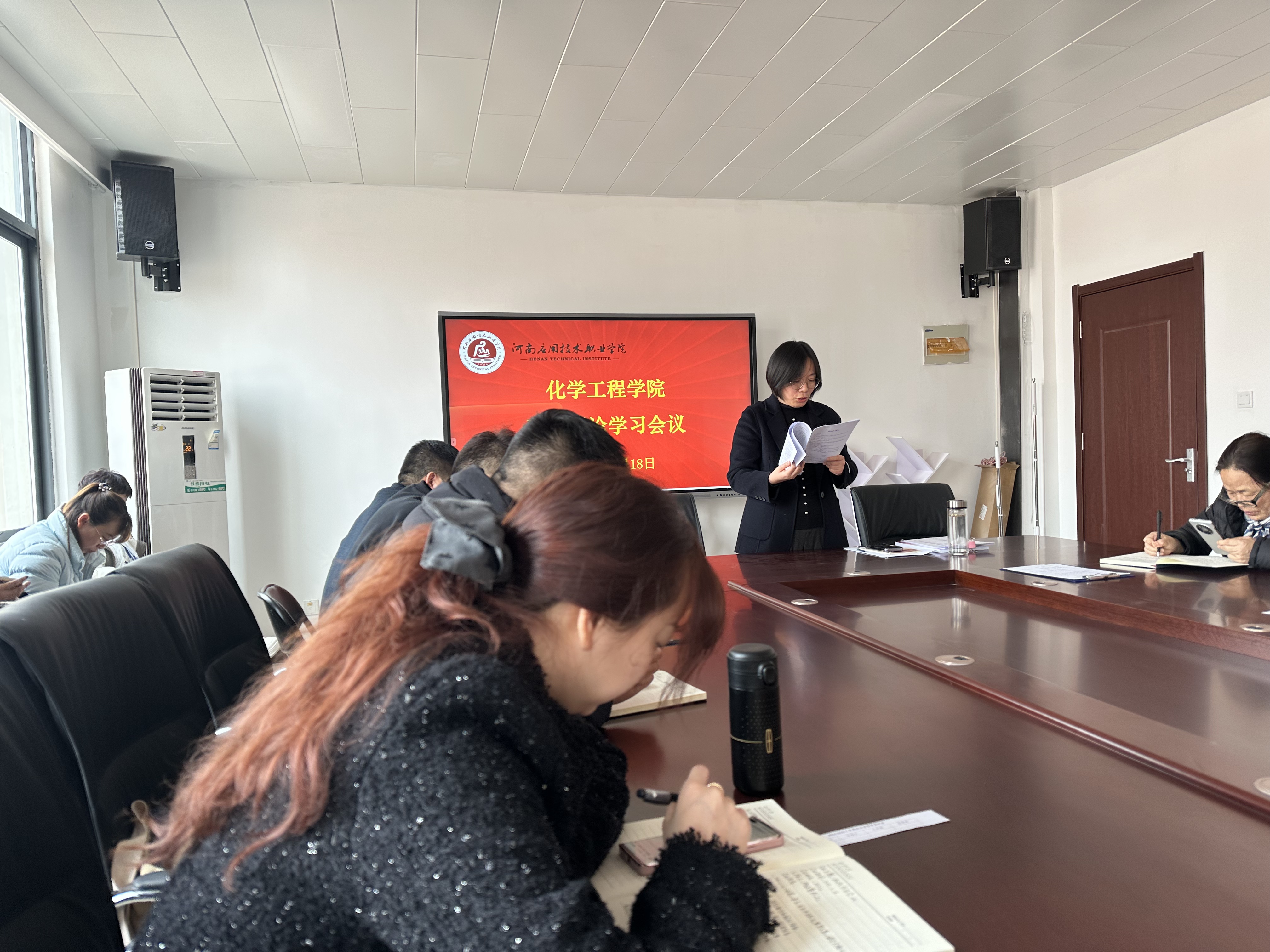 2月18日下午14:30,化学工程学院在A512召开全体教师政治学习会议。此次会议旨在深入学习贯彻重要文件和会议精神,进一步提升教师的政治素养和责任感。
