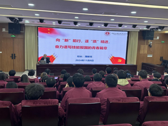 薄新党以《向“新”前行,逐“质”精进,奋力谱写技能报国的青春篇章》为题,深入浅出地解释了新质生产力的内涵特征,运用生动的案例和详实的数据讲述了新质生产力的战略意义,科学回答了如何培育发展新质生产力,同时结合新一轮产业革命大势阐述了新时代职业教育的使命。他指出,青年学生作为活跃于时代前沿的弄潮儿,是未来引领推动新质生产力发展的生力军,希望大家在以后的学习生活中能提高自我要求,一是要以大国工匠为榜样,弘扬工匠精神,争做有理想、敢担当、能吃苦、肯奋斗的新时代好青年;二是提升数智素养,把握数字化、网络化、智能化融合发展的契机,以信息化、智能化为杠杆培育新动能;三是做好学习规划,将个人志向与时代发展相融合,不断淬炼技能本领,谱写技能报国的青春篇章。