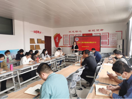 2022927下午化学工程学院党总支组织全体教工在A512召开2022年下半年第2次政治理论学习,会议通过会上集中学习、会中交流研讨等方式,深刻领会《习近平谈治国理政》第四卷部分)、《习近平关于坚持和完善党和国家监督体系论述摘编》、《习近平生态文明思想学习纲要》等重要论述的核心要义、精神实质、丰富内涵和实践要求。会议由学院党总支书记陈永惠主持。