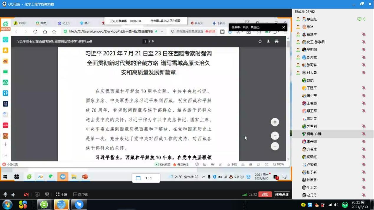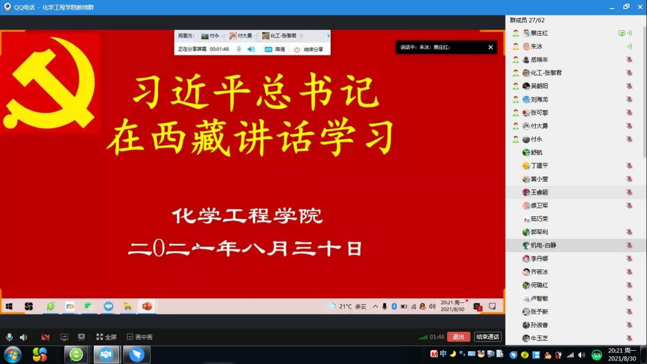 8月30日,化学工程学院党总支召开全体教师线上专题学习会,传达学习习近平总书记视察西藏时的重要讲话精神,会议由院党总支书记蔡庄红主持。