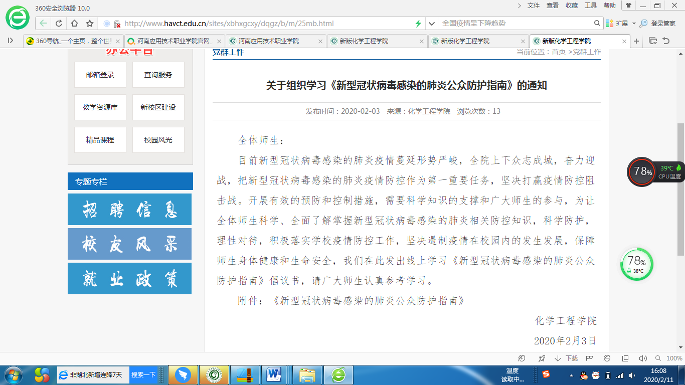 学院积极组织党员教师,发挥专业特长,制作微课,帮助大家解决家用消毒、温度测量等过程中的常见问题;组织辅导员坚守在网络一线,24小时守护在学生身边,用一句句日常的交流,缓和学生被困外地的焦虑,疏导学生宅在家里的急躁;组织全体教师收集和转发科普知识,积极互动,转发科普知识,防控网络舆情,引导学生不造谣、不信谣、不传谣。
