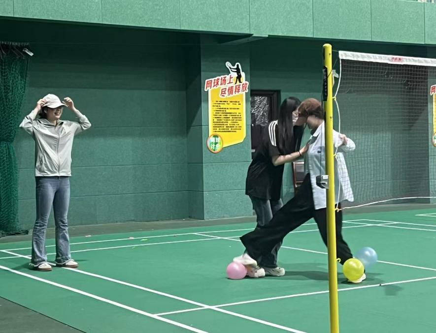 “气球大战”更是让活动现场充满了欢乐与刺激。随着音乐声响,大家互相踩对方腿上绑的气球。这个游戏不仅让同学们释放了压力,还增强了他们的竞争意识和团队合作精神。
