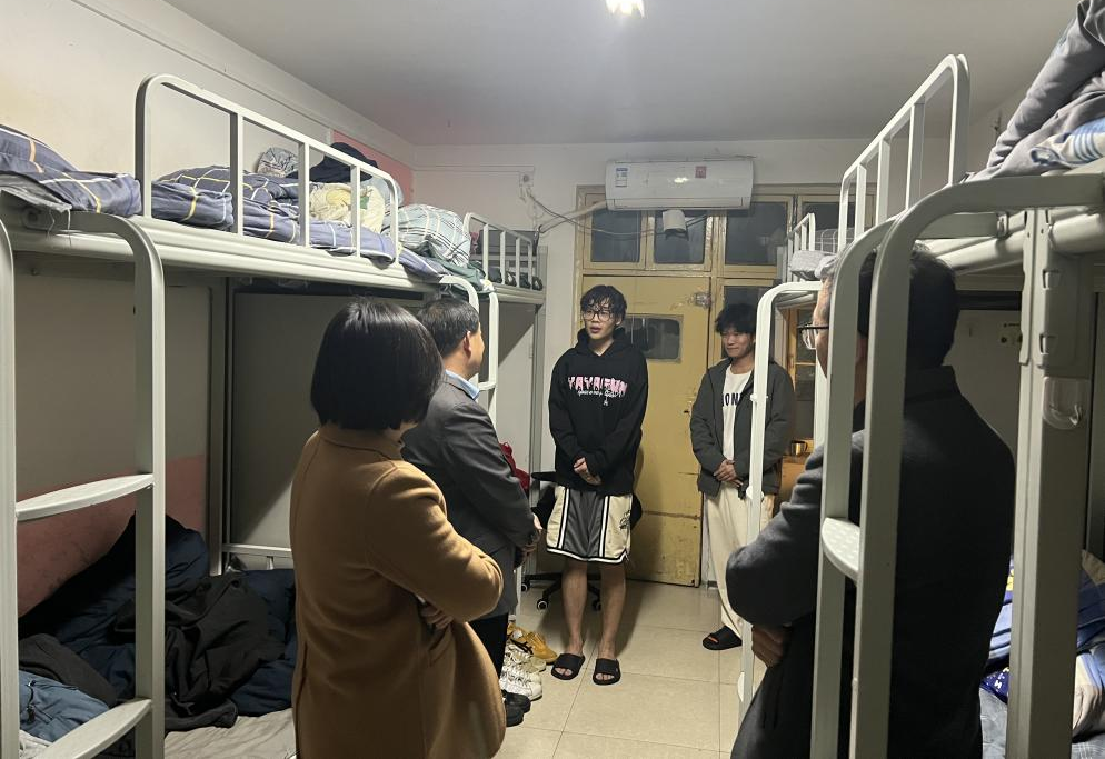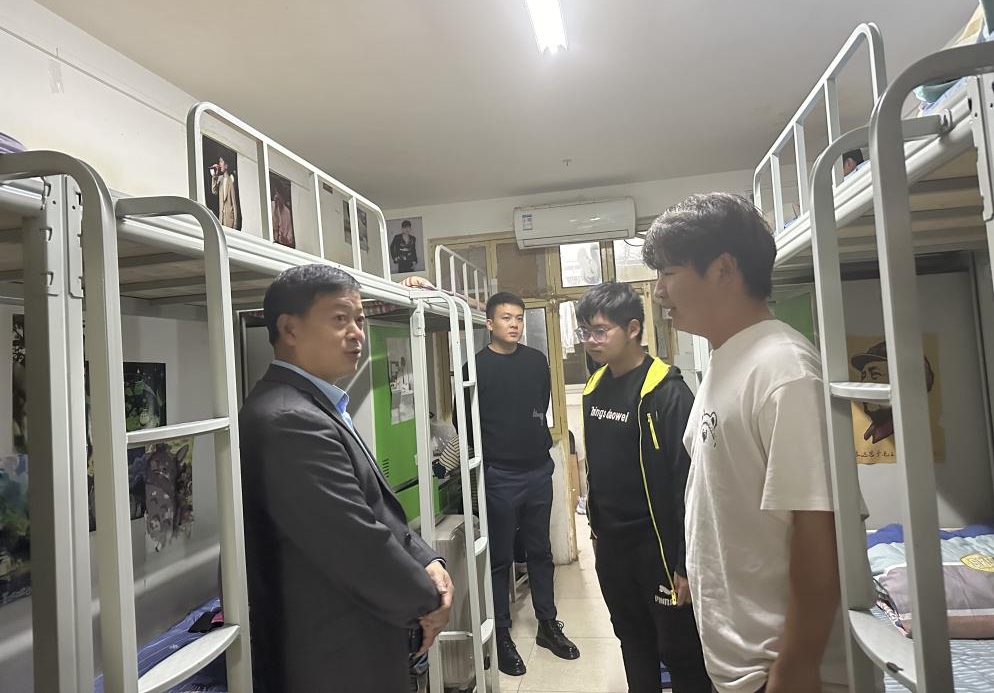 在化学工程学院院长朱冰、党总支书记陈永惠、副院长柴凤兰、副书记常惟诚的陪同下,刘校长走进了化学工程学院学生宿舍。一进门,温馨的氛围便弥漫开来。刘校长亲切地与同学们交谈,目光中满是关切。他详细询问同学们的学习情况,同学们积极回应,有的分享在复杂化学公式学习中的小窍门,有的则倾诉实验失败后的沮丧。刘校长认真聆听,不时给予鼓励的话语和肯定的眼神。