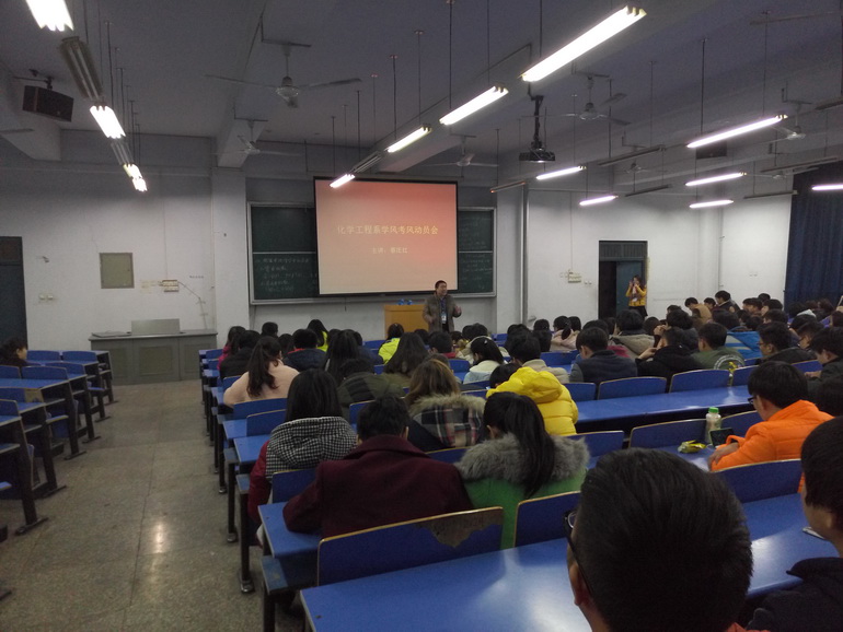 2015年12月3日,化学工程系召开中期学风考风动员大会。会议由系主任蔡庄红主持。会上,蔡主任就当下学风问题做了通报,对被处理的缺课学生做了通报,向同学们提出注意从细节做起,抓好学风。另外,蔡主任从案例谈起,分析了诚信的重要性,要求同学们做到诚信考试。