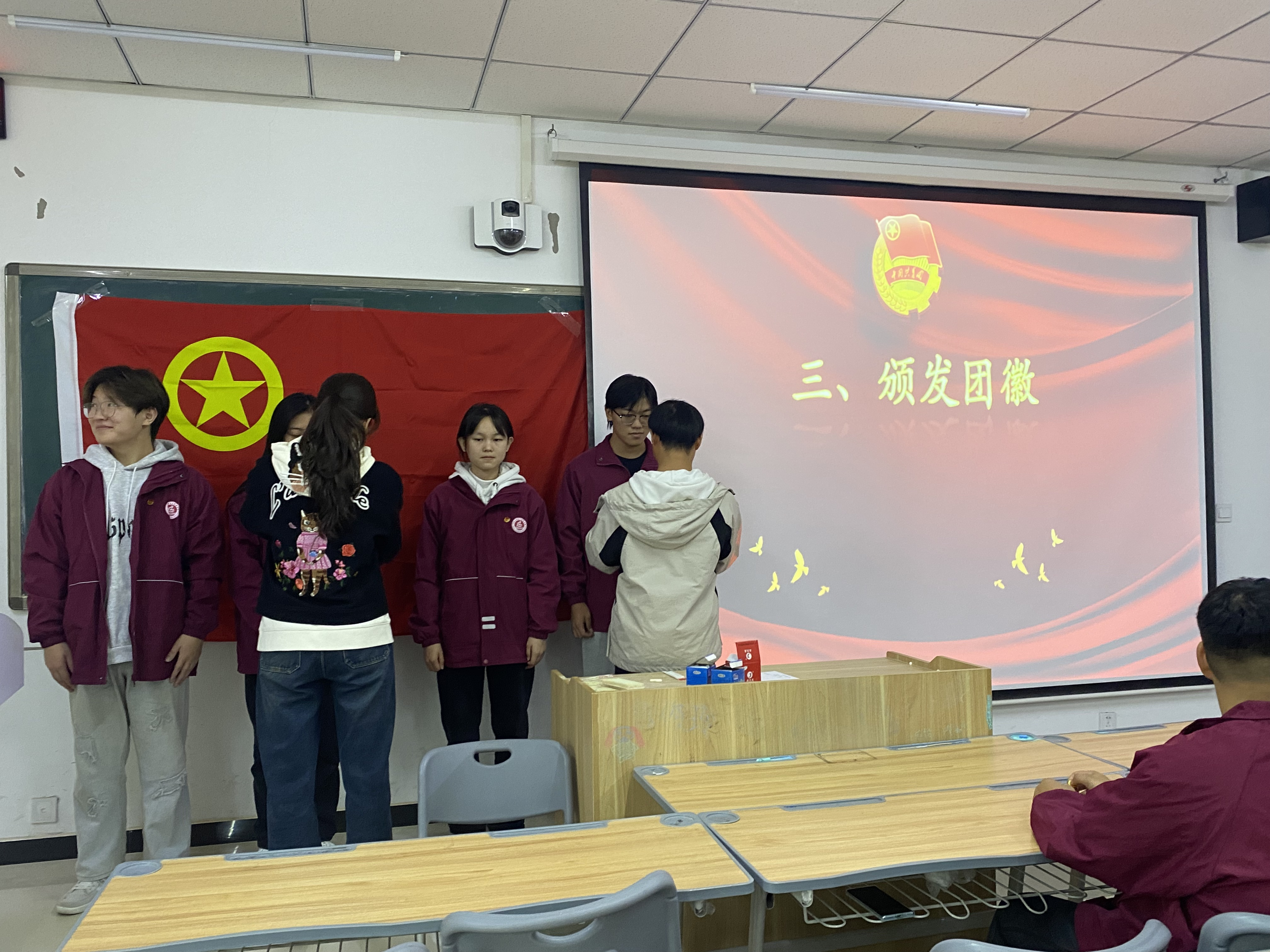 团员代表王梦梦同学宣布了新团员的名单。随后,团员代表为新团员佩戴团徽。