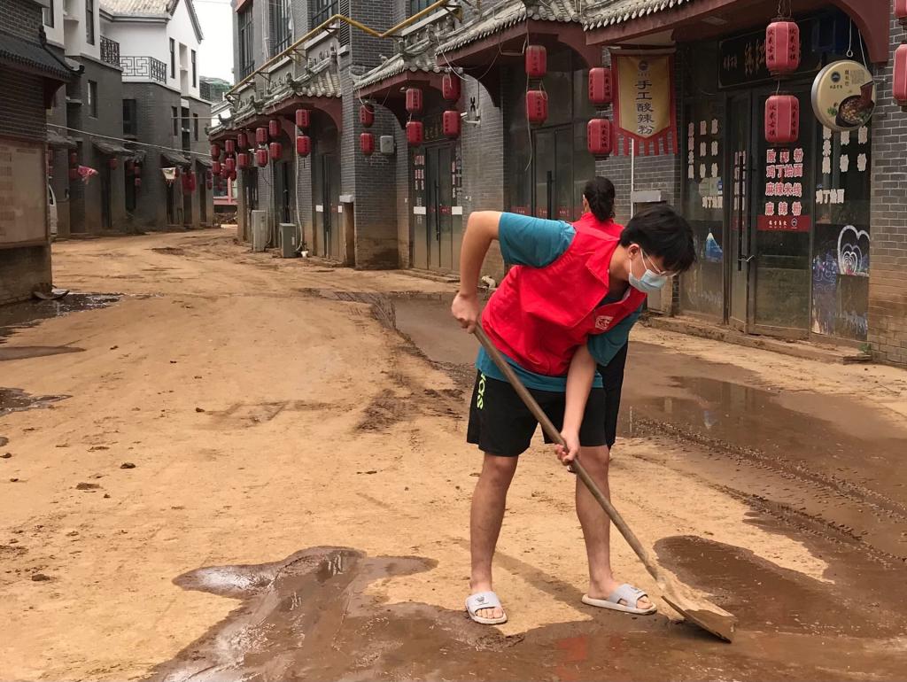 化工2004班,薛博文同学在假期闲暇之余,尽自己力所能及的事情,参加志愿者活动,帮助清理上次洪灾冲刷到街面的厚厚的淤泥,虽然很累但是我的内心却是无比光荣。