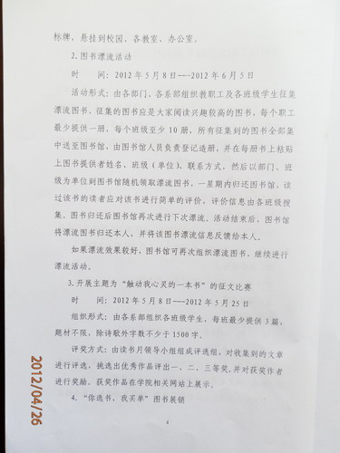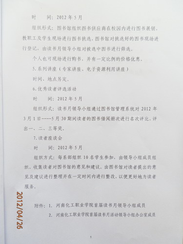 化学工程系全体同学: 为丰富同学们课余生活,倡导好读书、读好书,树立良好的学习氛围,建设学习型校园,根据学院安排,我系将组织全体同学参加首届读书月活动,现将活动实施方案转发给大家,请踊跃参加。 化学工程系 2012年4月26日
