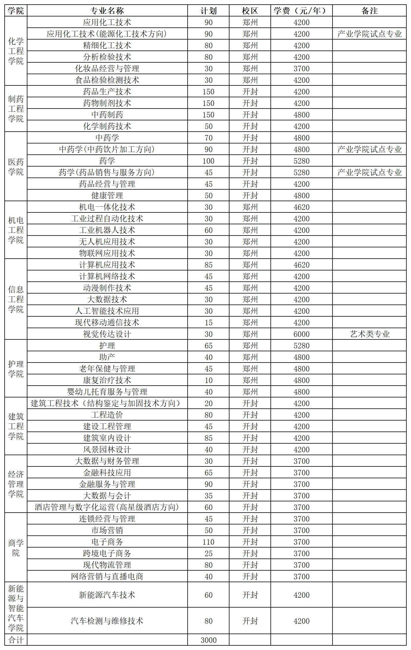 开封校区:药品生产技术、药物制剂技术、中药制药、化学制药技术、中药学、药学、药品经营与管理、健康管理、建筑工程技术(结构鉴定与加固技术方向)、工程造价、建设工程管理、建筑室内设计、风景园林设计、大数据与财务管理、金融科技应用、金融服务与管理、大数据与会计、酒店管理与数字化运营(高星级酒店方向)、连锁经营与管理、市场营销、电子商务、跨境电子商务、现代物流管理、网络营销与直播电商、新能源汽车技术、汽车检测与维修技术、药学(药品销售与服务方向)、中药学(中药饮片加工方向)。