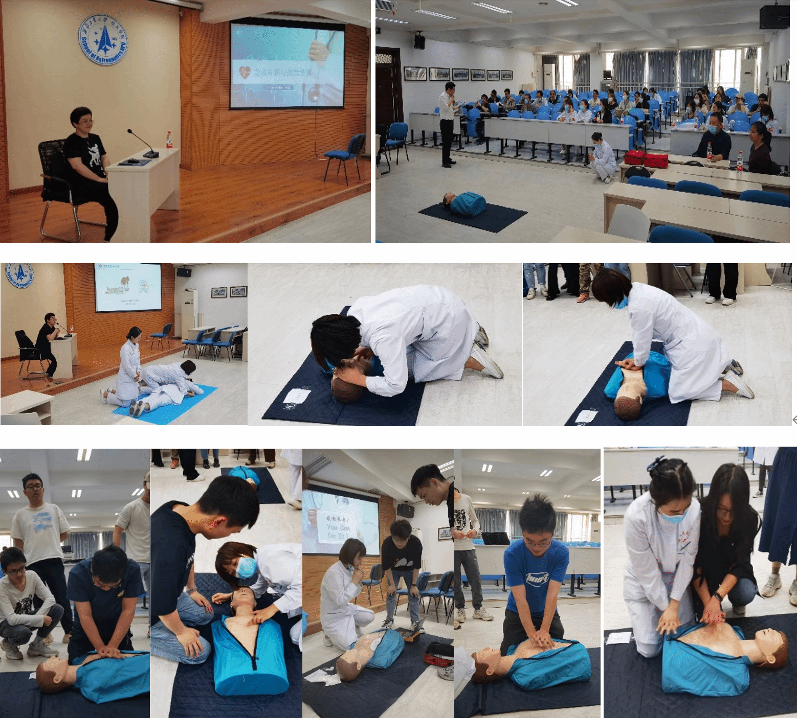 之后,校医院住院部党支部成员沙娟娟副主任医师为永利集团官网师生做了《急救知识与技能培训》报告,详细讲解了心肺复苏基本理论知识及实践操作要点、自动体外除颤器( AED) 的使用和海姆立克急救法。讲解过程中,校医院工作人员现场演示心肺复苏,AED 实践操作方法,使大家深入了解心肺复苏相关救护知识。同时,为了更加细致解答师生在急救操作过程中存在的问题,校医院汤燕医生、刘瑁医生、袁华护士、马沛瑶护士、王丽护士和董豪护士等手把手指导现场师生练习急救操作。通过本次培训,学院师生基本掌握了心跳呼吸骤停及气道异物梗阻的急救方法,提升了应急处置能力,取得了非常好的效果。