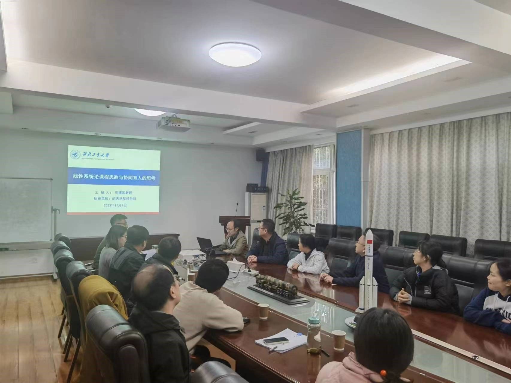 永利集团官网精确制导与控制研究所所长郭建国教授、党支部书记卢晓东和教职工15人参加了交流会和主题党课活动。首先,郭建国教授以“线性系统理论课程思政与协同育人”为主题讲述了在“线性系统理论”课程教学中所采用的课程思政方法,并总结了协同育人的理念与措施。“线性系统理论”课程是我校控制类公共专业基础课程,该课程和教学团队2022年分别获永利集团官网课程思政示范课程和课程思政团队。郭建国教授以家国情怀、责任担当、思辨能力培养和航天工程事例等四个维度,详细介绍了线性系统理论课程开展教学思政的相关事例和融入课程的教学方法。同时也从课程育人、实验育人和实践育人等方面介绍了教学团队在协同育人方面的特色做法和取得的成绩。随后,参会党员和教师针对课程思政和立德树人等方面进行充分的交流和讨论。