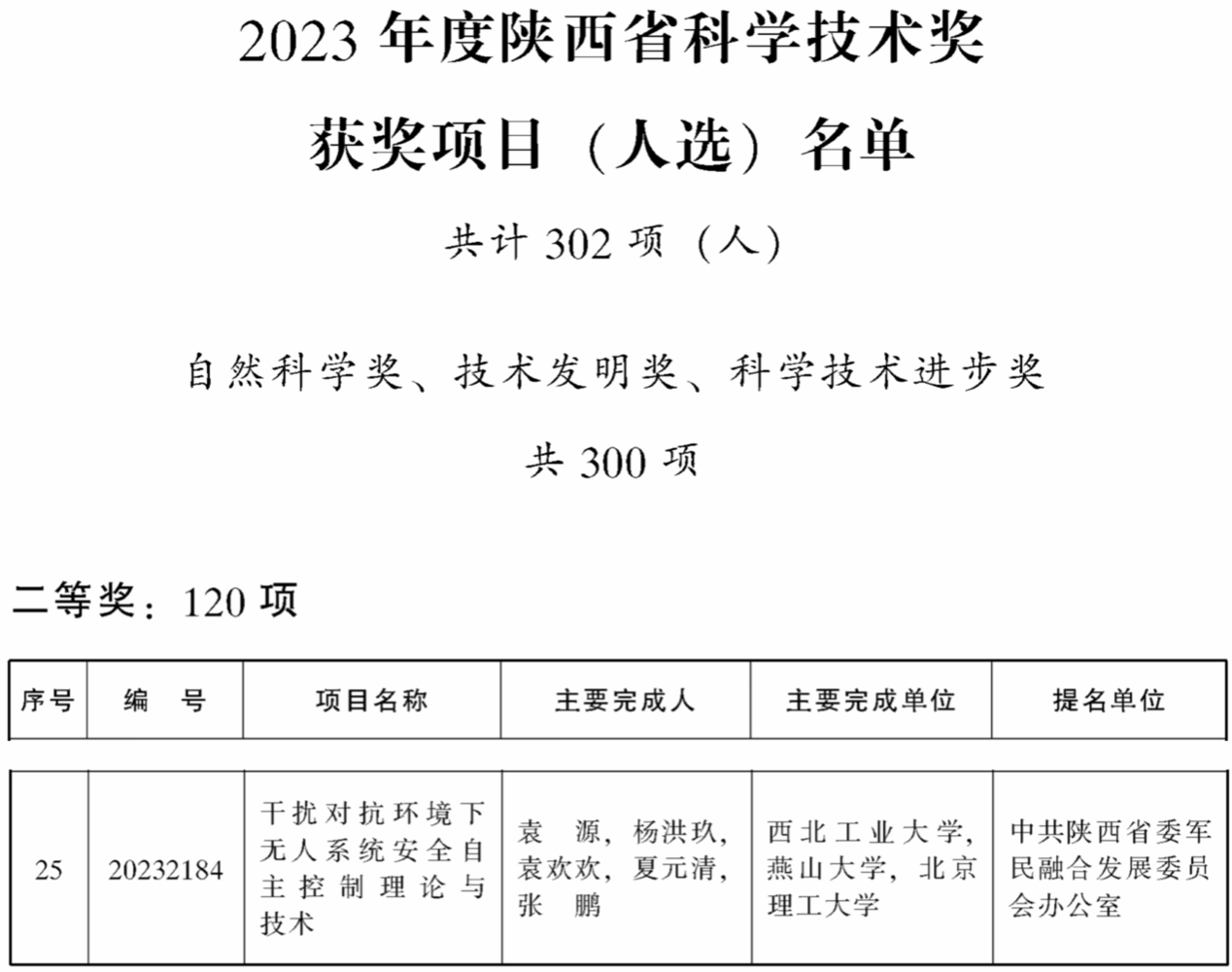 近日,陕西省人民政府公布了2023年度陕西省科学技术奖励获奖名单,永利集团官网袁源教授《干扰对抗环境下无人系统安全自主控制理论与技术》荣获自然科学二等奖!