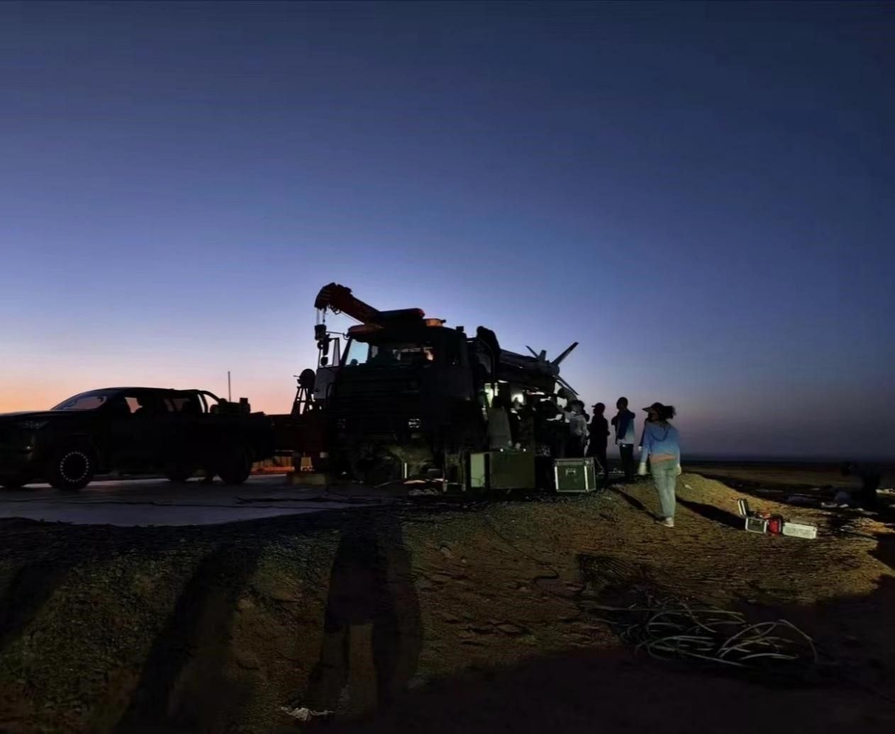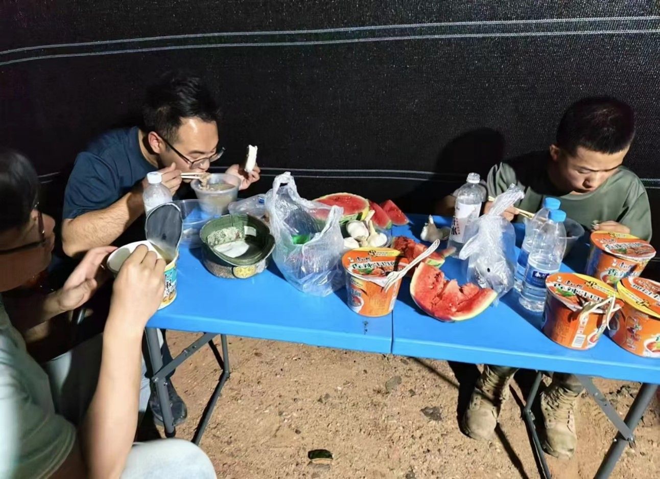 7月21日下午,实践队跟随参试单位抵达阵地。为了能够赶上第二天的发射窗口,茫茫戈壁上,老师带领同学们在烈日炎炎下,顶着飞沙走石全心地投入到准备工作中。装车、搭帐篷、调试设备……同学们几乎参与到了每一个环节。待准备工作完成后,已到了深夜十一点,顶着戈壁独有的漫天星辉,实践队成员终于有了些许时间吃晚饭,而这一刻,“披星戴月”有了真实的画面感。