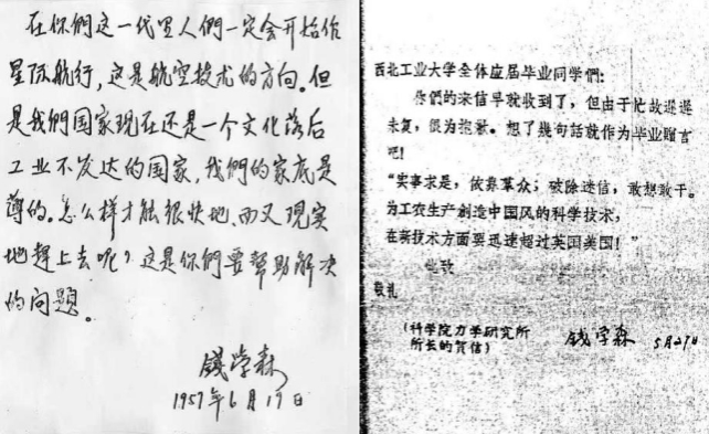图|钱学森分别在1957年和1958年给永利集团官网师生的致辞