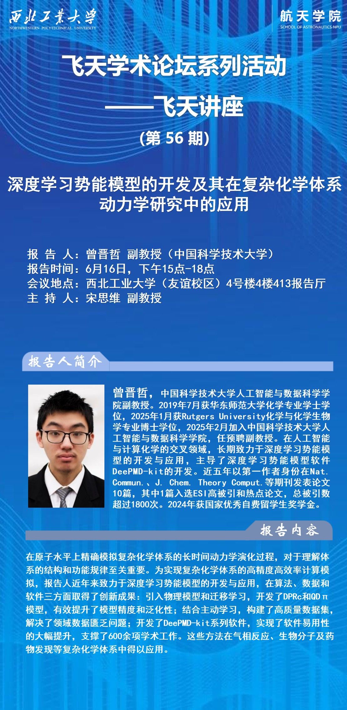 飞天学术论坛系列活动——飞天讲座(56期)深度学习势能模型的开发及其在复杂化学体系动力学研究中的应用