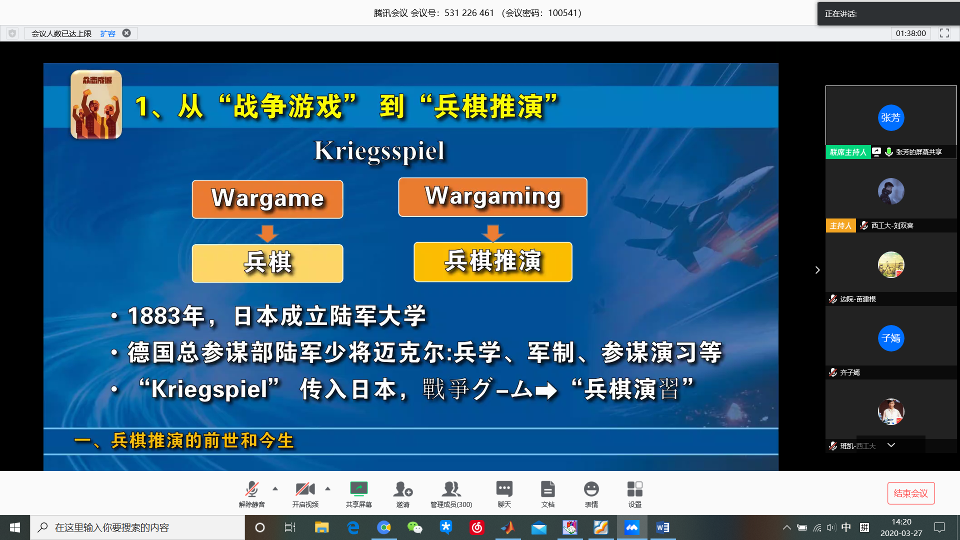 为深入贯彻落实国家国防教育办公室下发的《2020年全民国防教育工作安排》(国动教育﹝2020﹞1号)有关内容和要求,进一步提升陕西省兵棋推演比赛项目的科学化、整体化水平,助力我省国防教育工作广泛、深入、持久地开展,3月27日14:00,我校通过腾讯会议举办了永利集团官网2020年国防教育活动月主题报告会,火箭军工程大学张芳大校受邀作了题为《兵棋推演—让你了解未成形新技术潜力的有效工具》。本次报告吸引了150余名工大学子以及来自西安交通大学、西安理工大学、北京科技大学、北京化工大学、中北大学、边海防陆军学院、航天一院等军地院校共计300名师生齐聚云端。会议由永利集团官网党委副书记王强主持。