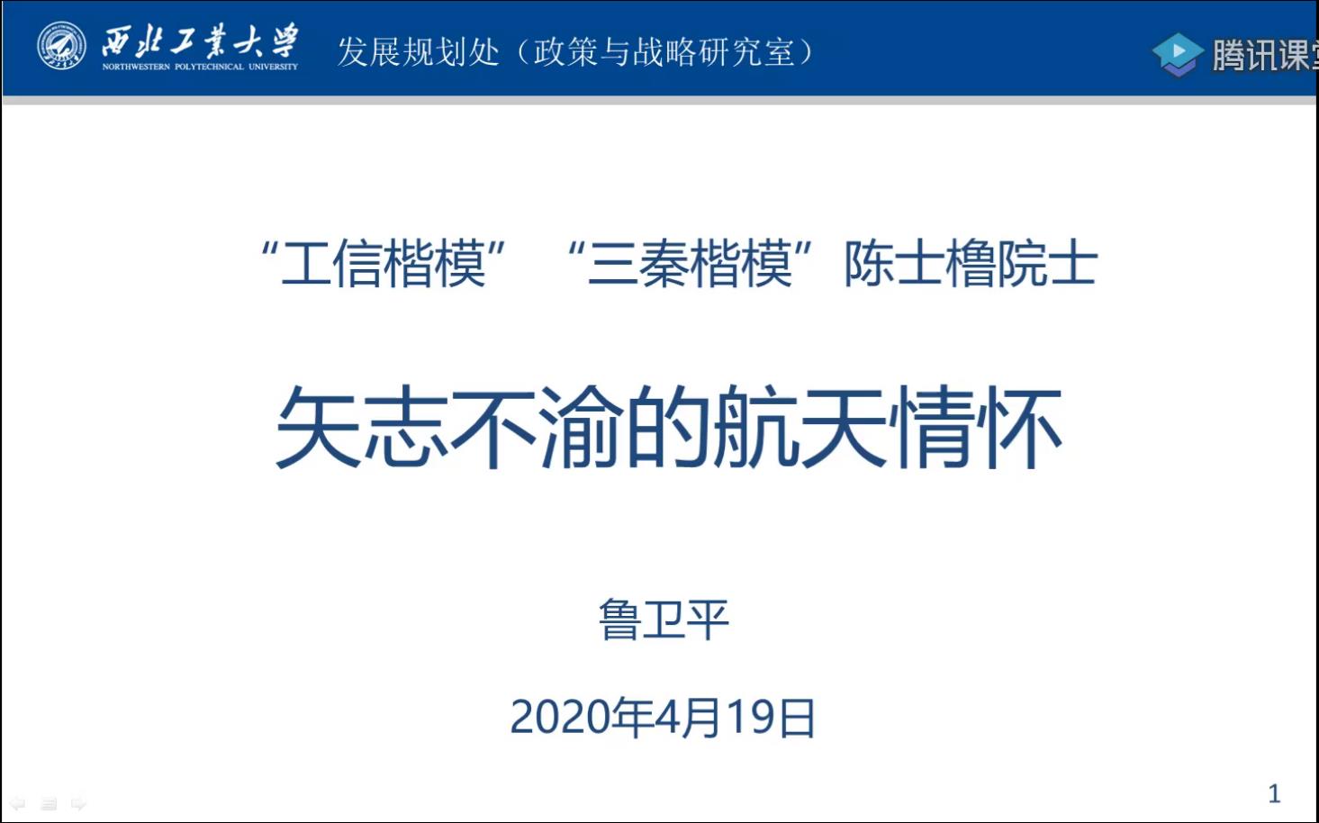 4月19日上午,永利集团官网发展对象、入党积极分子迎来新学期第一节党课。本次专题党课通过“翱翔青年云讲堂”开展,本场云讲堂由校团委、永利集团官网主办,西工大青年宣讲团、永利集团官网研究生会承办,特别邀请了永利集团官网政策与战略研究室主任兼发展规划处副处长、《剑指苍穹—陈士橹传》主要作者鲁卫平担任主讲人,讲述陈士橹院士“一个甲子的坚守”。