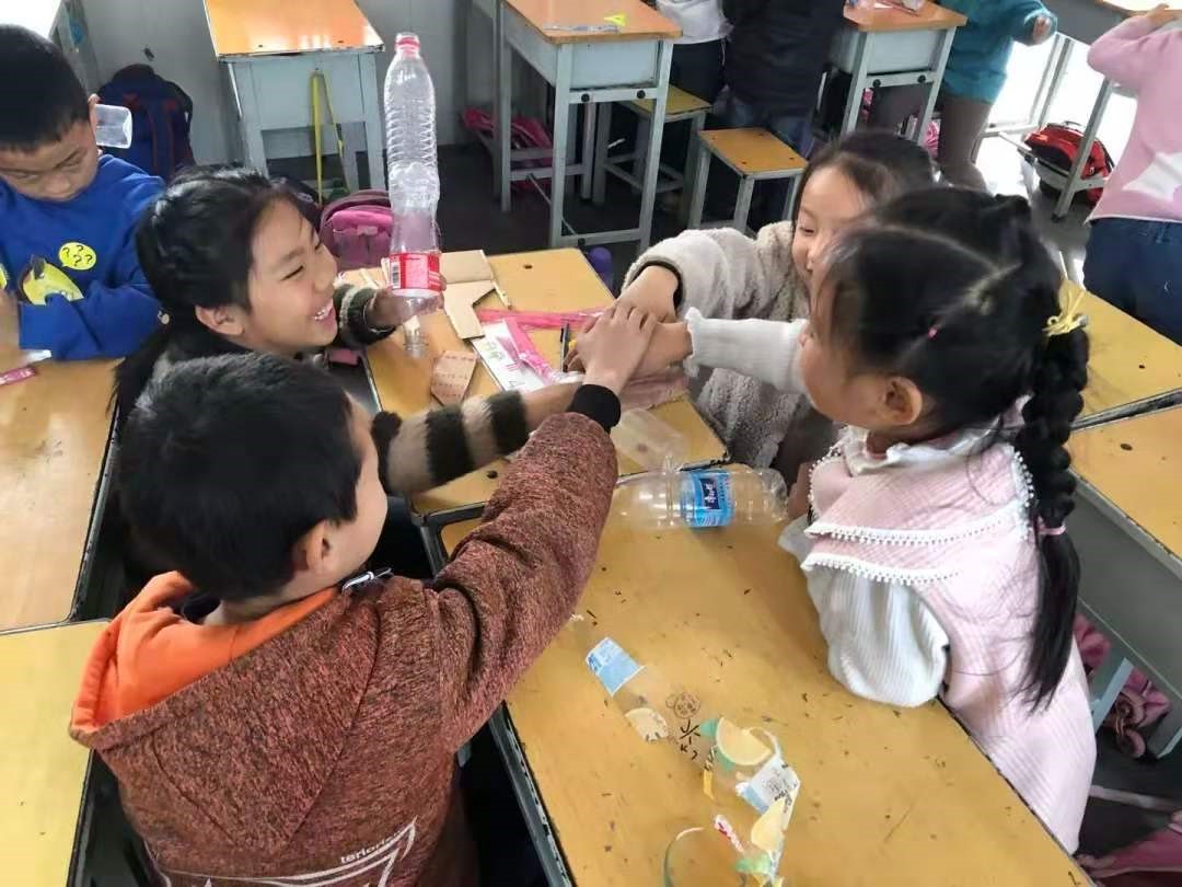 航天知识讲解环节结束后,志愿者开始教孩子们制作水火箭。同学们拿出事先准备好的饮料瓶、剪刀、胶带、卡纸等材料,在大哥哥大姐姐们的帮助下,完成了简易水火箭制作,并满怀欣喜地将自己的名字签在箭体上。
